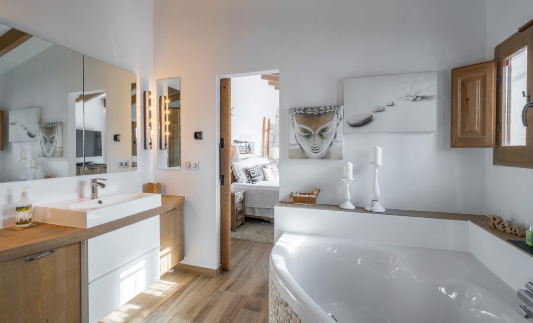 En la planta superior hay un espacio que actualmente se usa como oficina, pero que podría convertirse en un tercer dormitorio. Además, tiene dos vestidores independientes, un amplio dormitorio principal y un baño con bañera y ducha separada. Desde el dormitorio principal se accede a una segunda terraza.