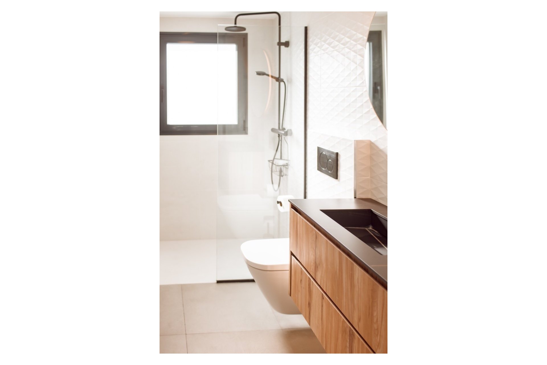 La climatización se compone de aire acondicionado frío/calor Mitsubishi en todos los dormitorios y el salón, con persianas automáticas. El agua caliente funciona mediante aerotermia. La vivienda incorpora cocina equipada con encimera de cuarzo, sistema de ventilación de doble flujo Siber con unidad de recuperación de calor e instalación fotovoltaica para autoconsumo. Los acabados son de alta calidad.