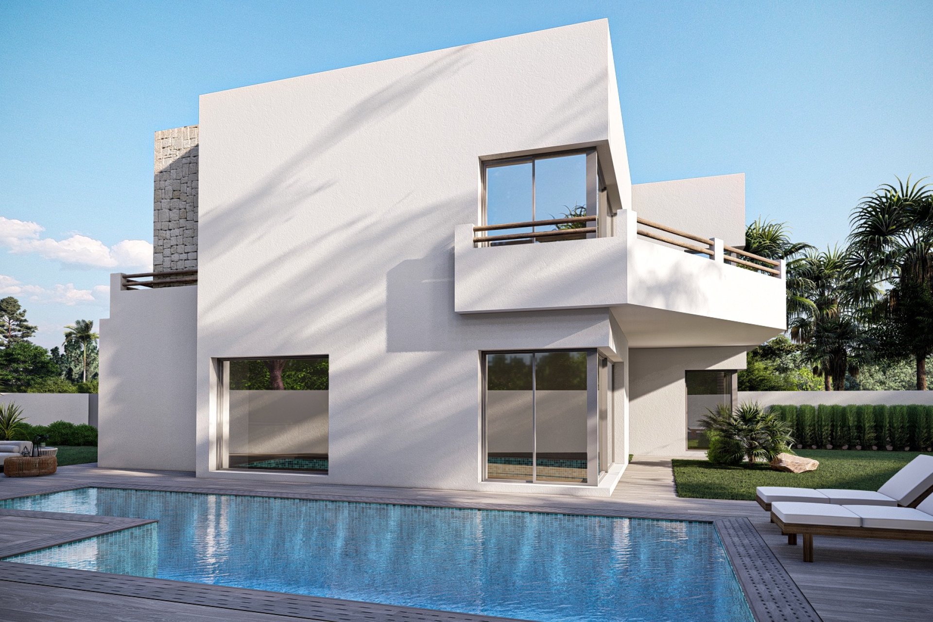 Buiten is er een spectaculaire entreeportiek in Ibiza-stijl en een grote houten deur die u verwelkomt. De woning beschikt ook over een prachtig terras naast de woonkamer, waar zich een zwembad met geïntegreerde trap bevindt en een zitbank voor de mogelijke installatie van een jacuzzi. De geïntegreerde garage biedt plaats aan één voertuig en is voorzien van een oplaadpunt voor elektrische auto's, met de mogelijkheid om een extra voertuig op het perceel te parkeren.