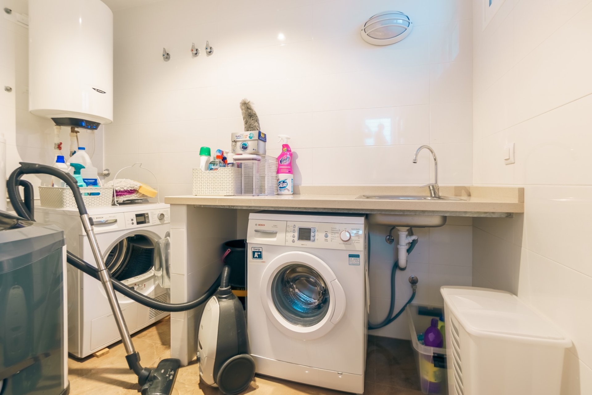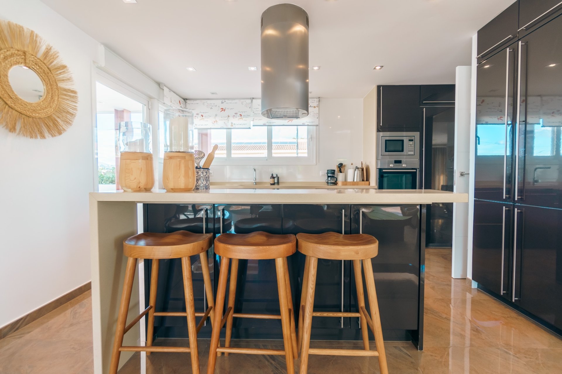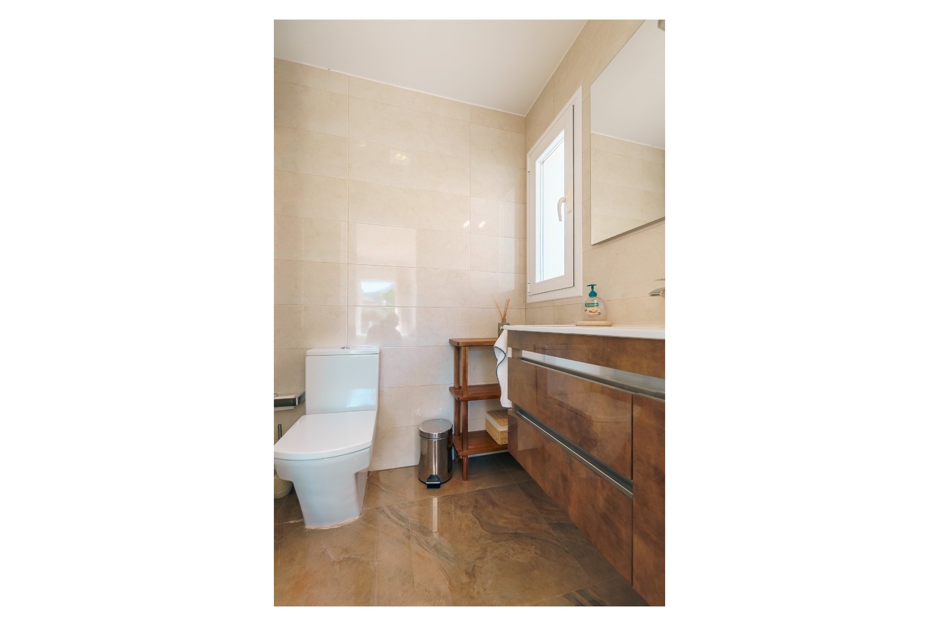 On the ground floor, there is a spacious living-dining room with an open-concept kitchen and a guest toilet. The upper floor houses the main suite, which features a large private bathroom and a private west-facing terrace, as well as access to the front south-facing terrace with views of Sierra Helada and the communal gardens. On this level, there are also two guest bedrooms, one of them with an en-suite bathroom, as well as an additional bathroom. All bedrooms have direct access to the south-facing terrace.