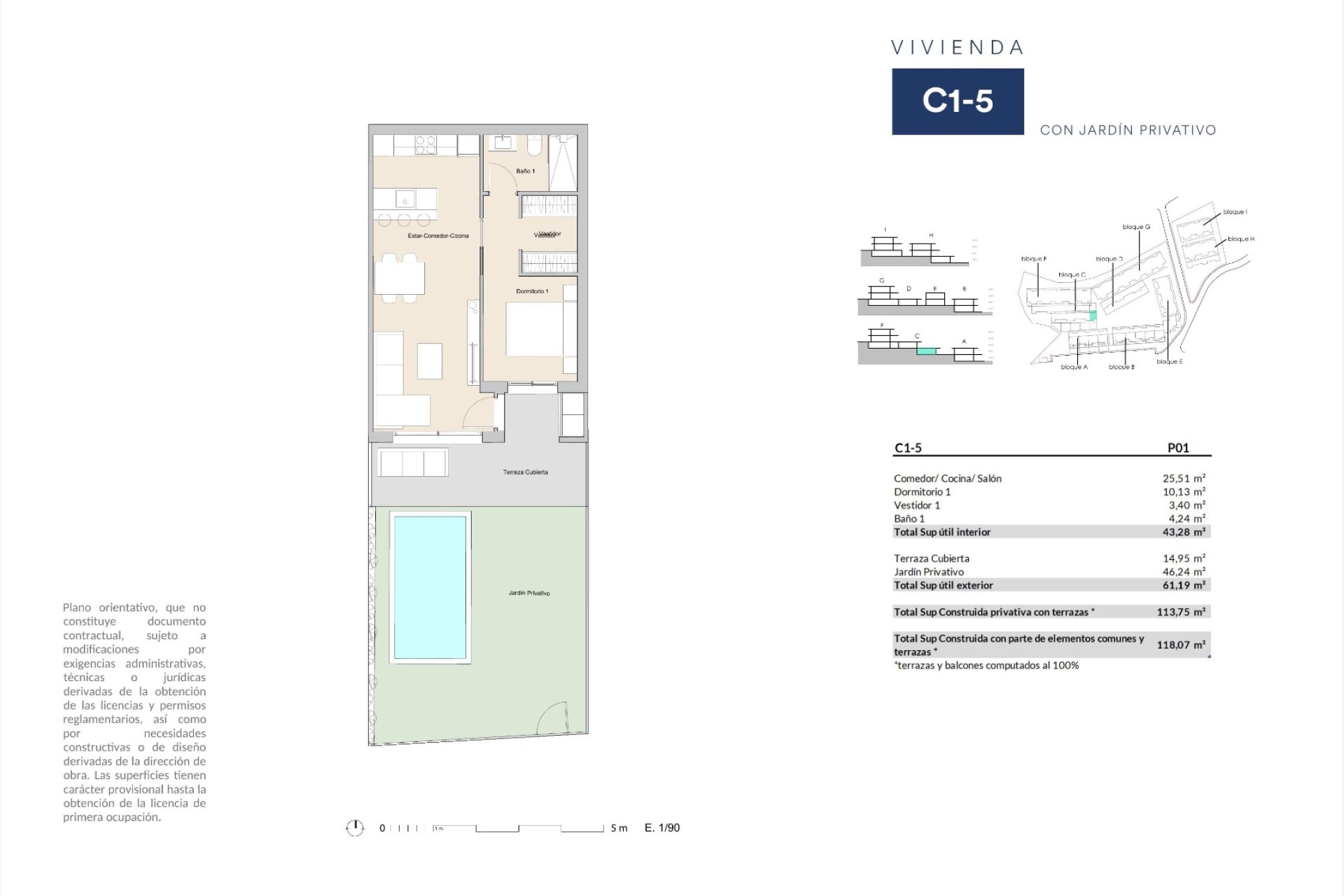round-floor apartment facing south, with one bedroom and one bathroom. The property offers a living-dining room with an open-plan kitchen and direct access to a glazed covered terrace that leads to a private 46 m² garden.